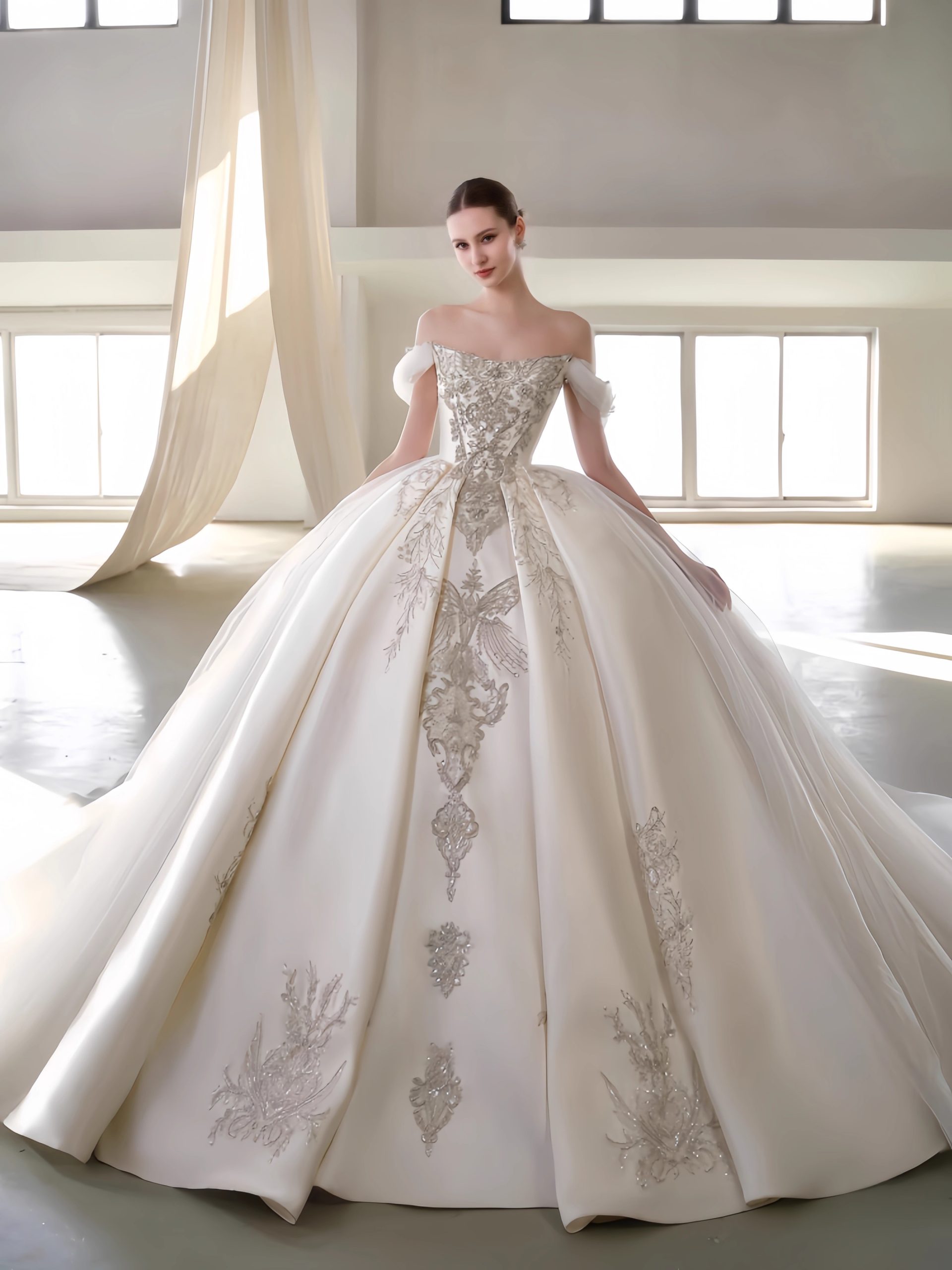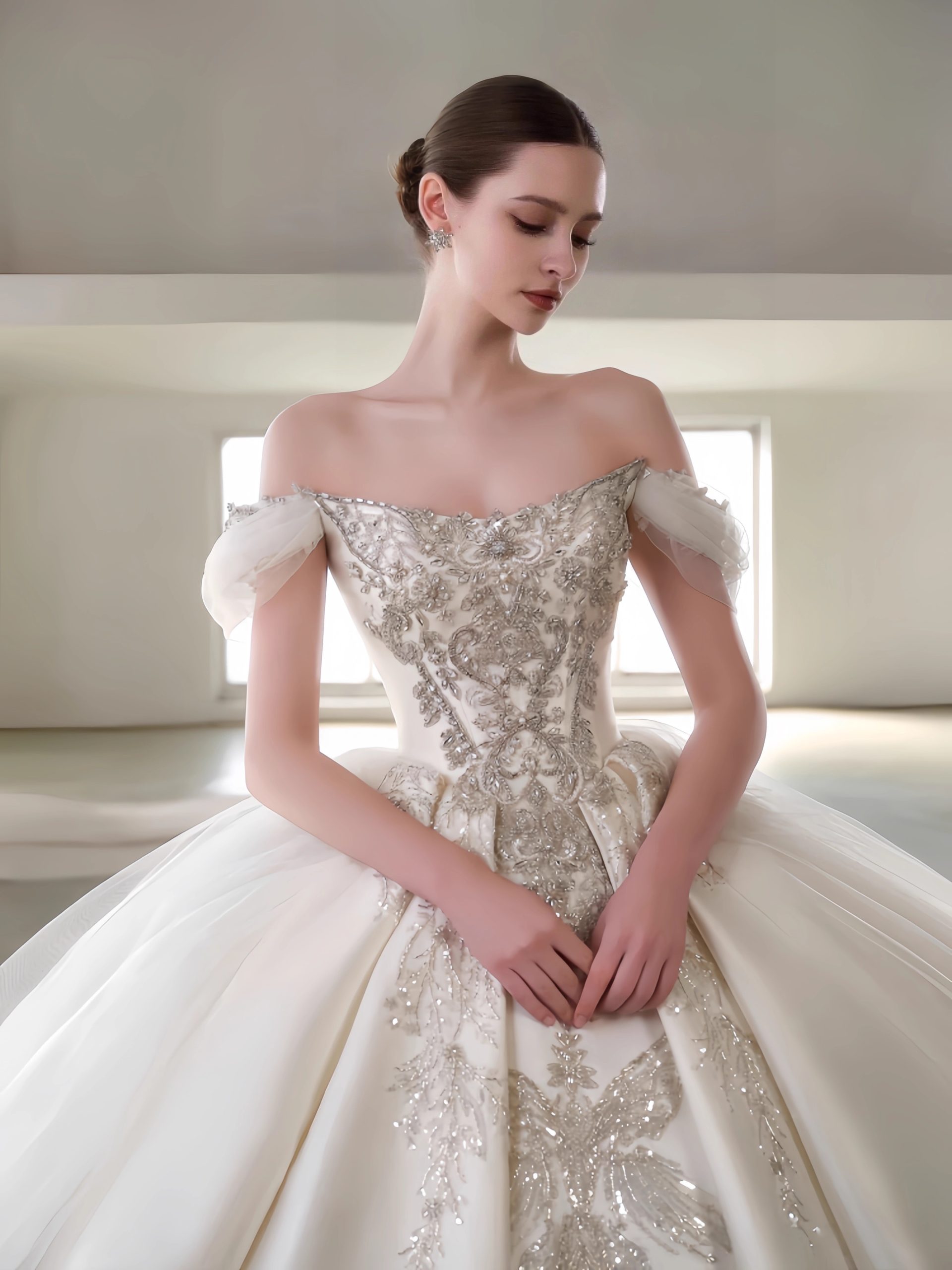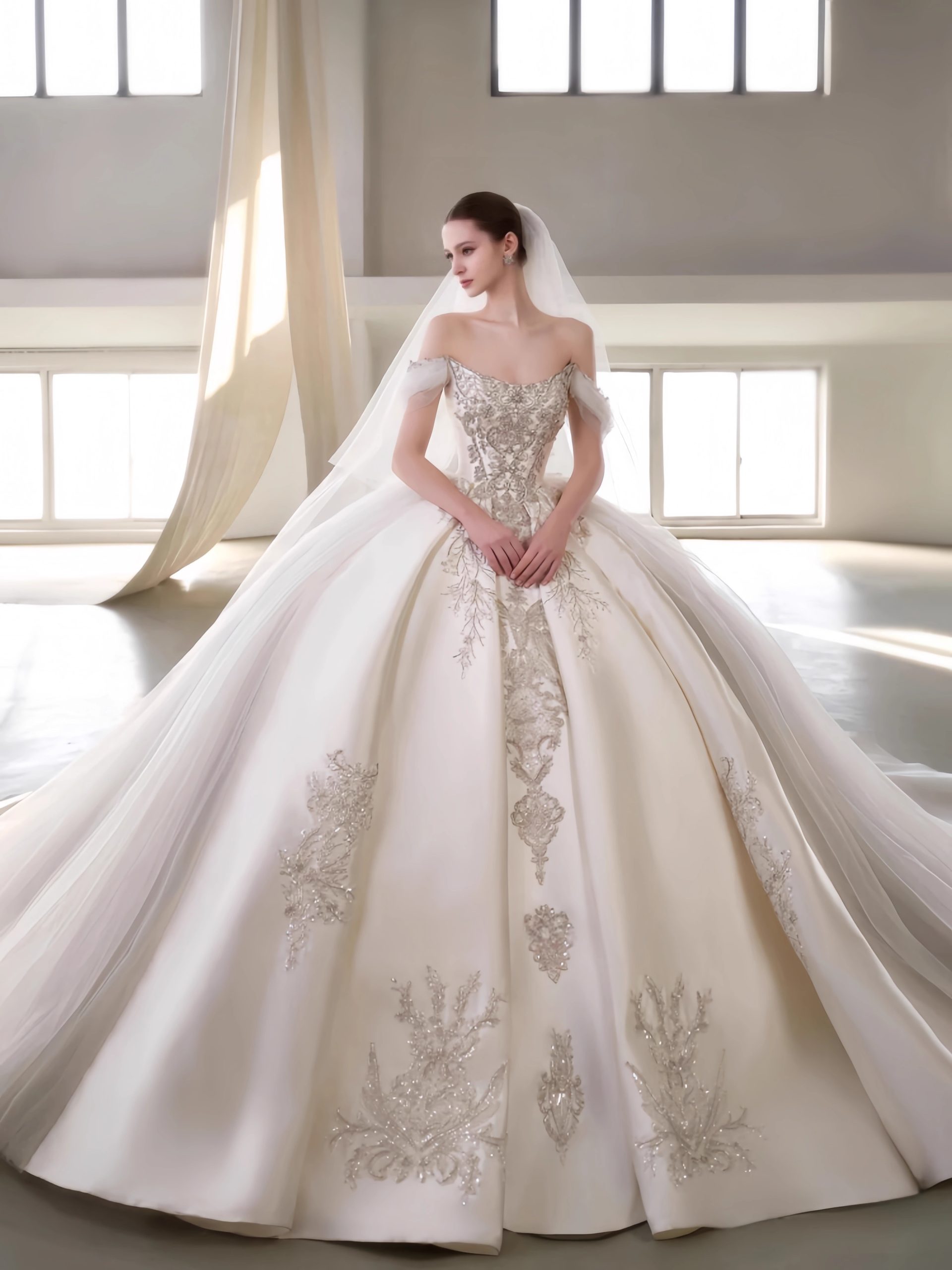 Inspired by royal archives,’The Gilded Heirloom’ is a court vintage ball gown. Featuring an off-shoulder neckline, luxurious ivory hand-embroidery, and beaded lace appliqués, this dress is a timeless investment for the discerning bride. Discover custom couture.
