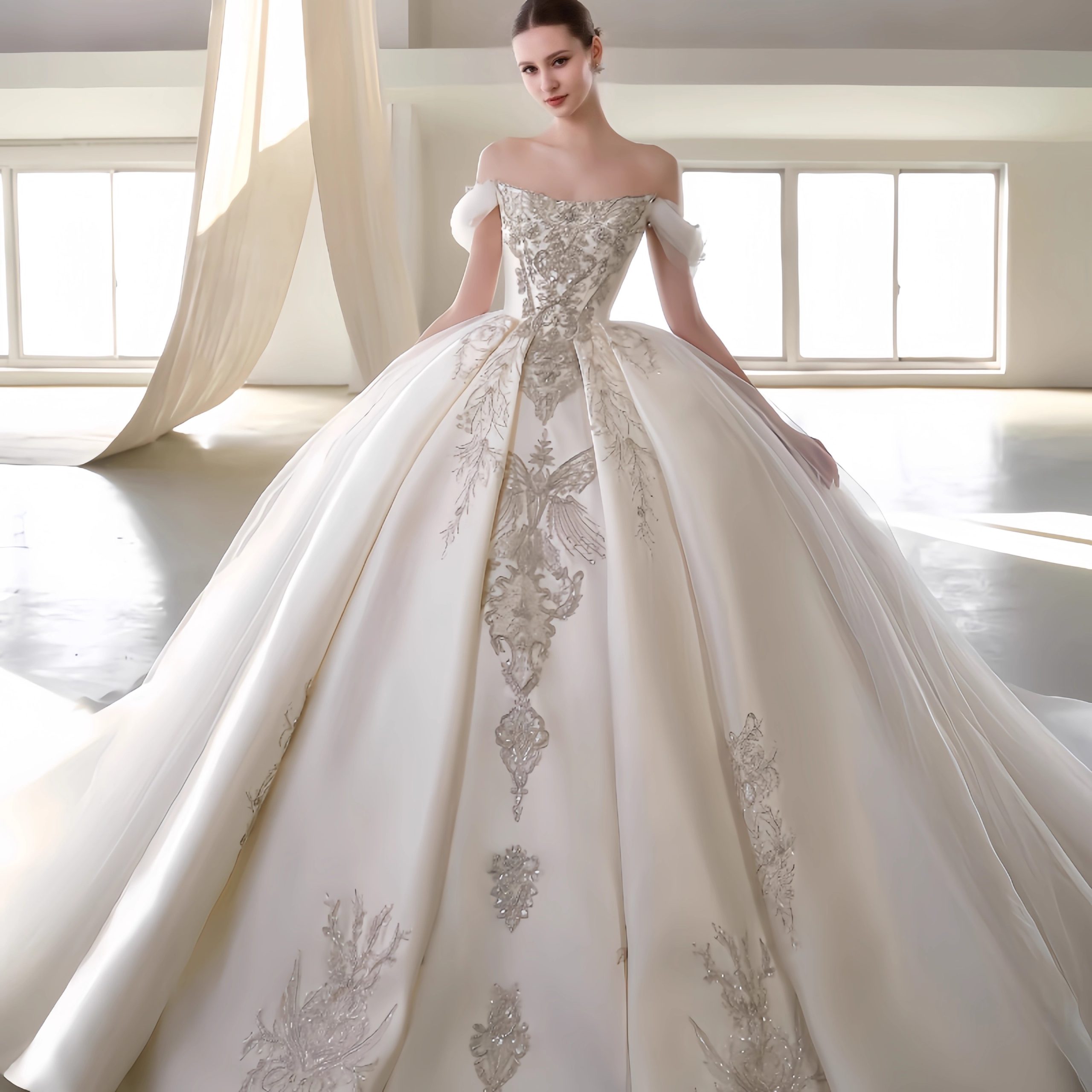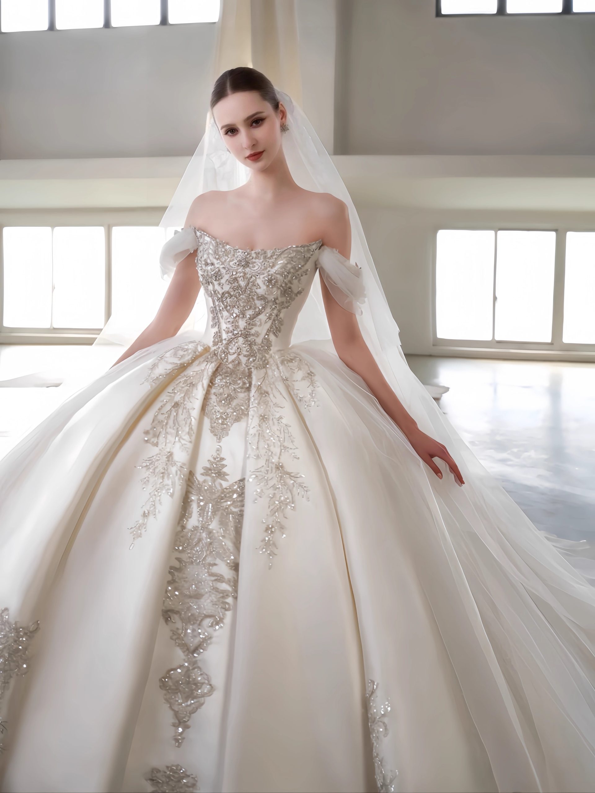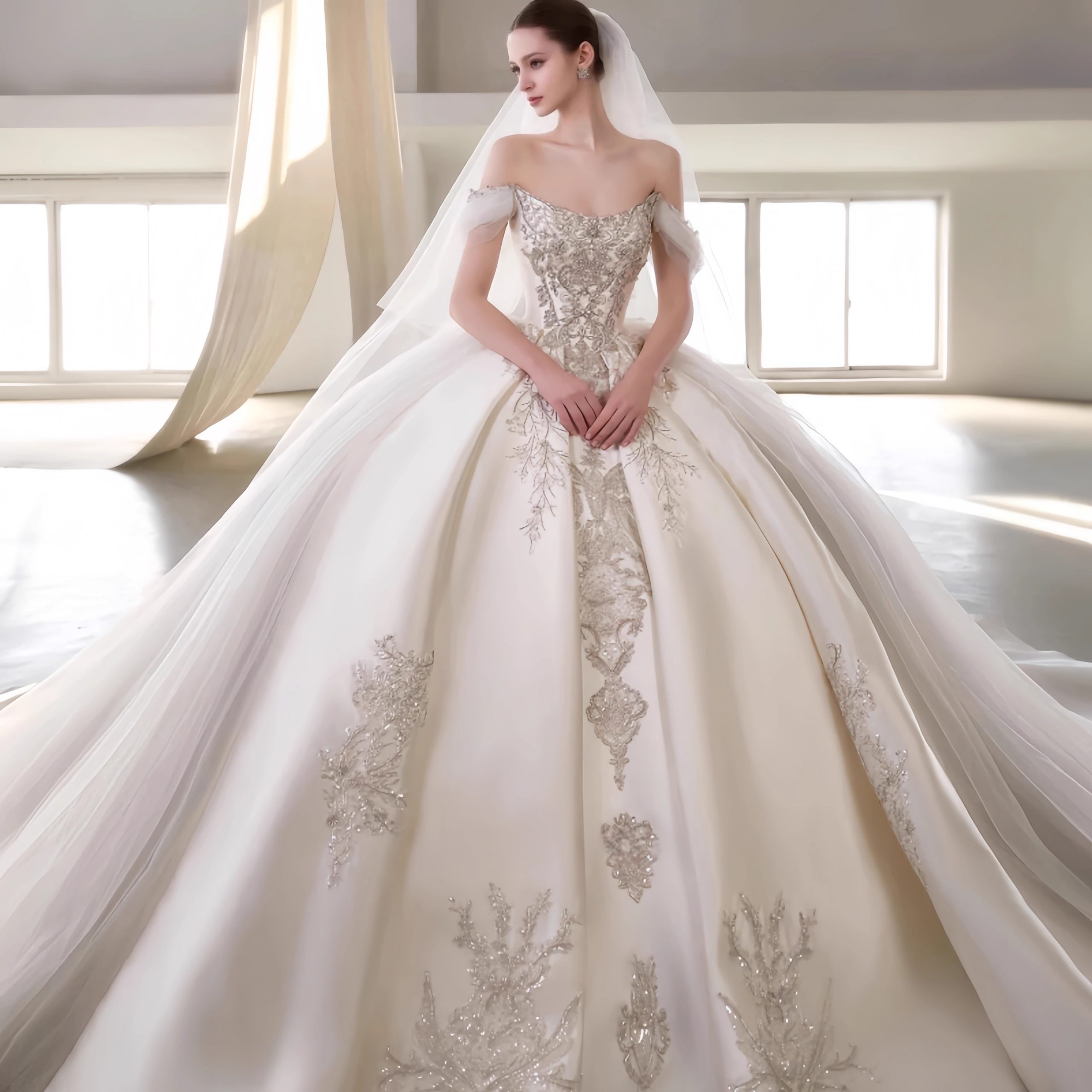 Inspired by royal archives,’The Gilded Heirloom’ is a court vintage ball gown. Featuring an off-shoulder neckline, luxurious ivory hand-embroidery, and beaded lace appliqués, this dress is a timeless investment for the discerning bride. Discover custom couture.