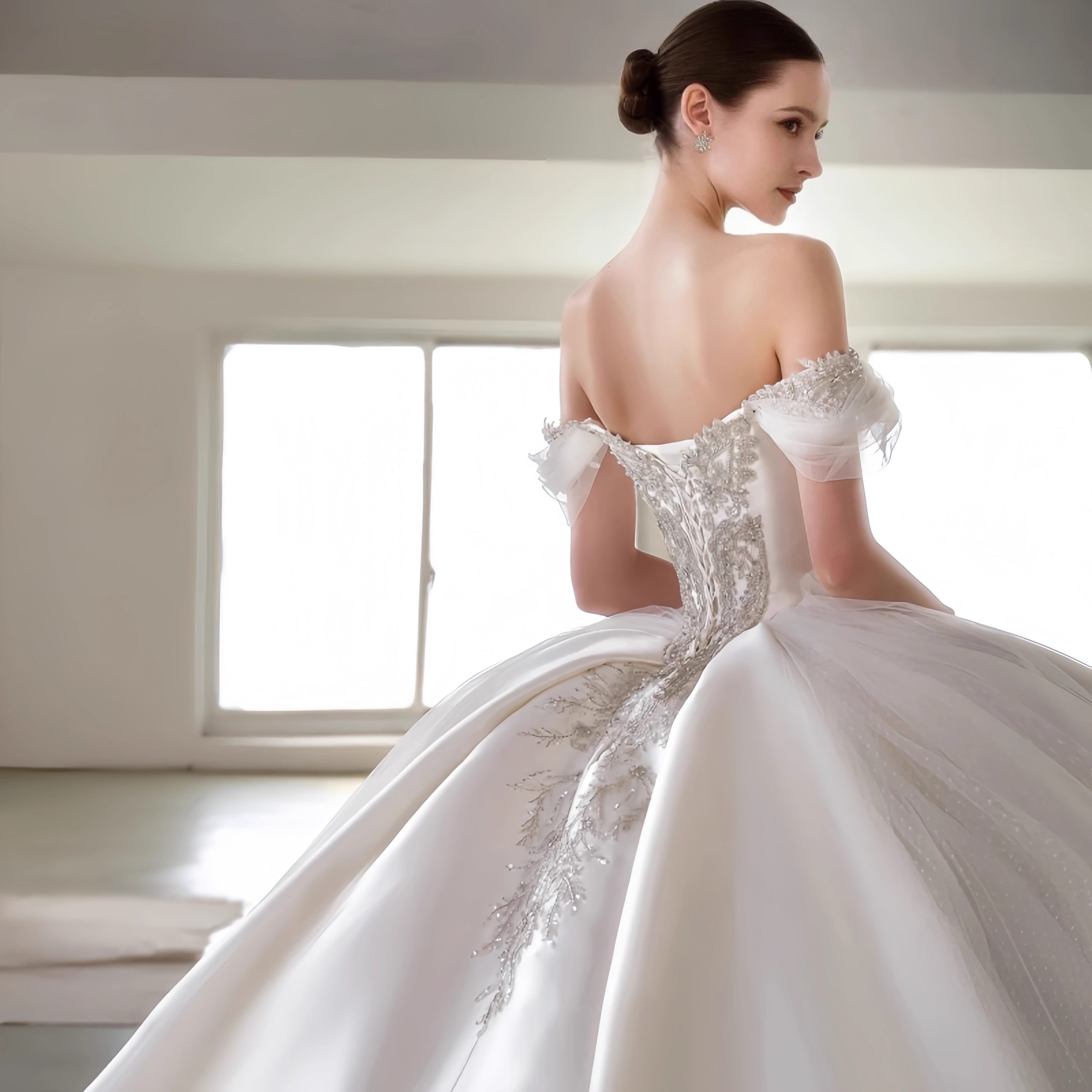 · Artisanal Hand-Embroidery : This ivory embroidered bridal gown showcases labor-intensive techniques like tambour hook embroidery and silk shading. Each motif—from delicate buds to sprawling vines—is stitched by hand, creating a soft, dimensional texture that appears organically grown from the fabric itself. This is the hallmark of true luxury.