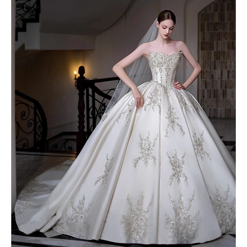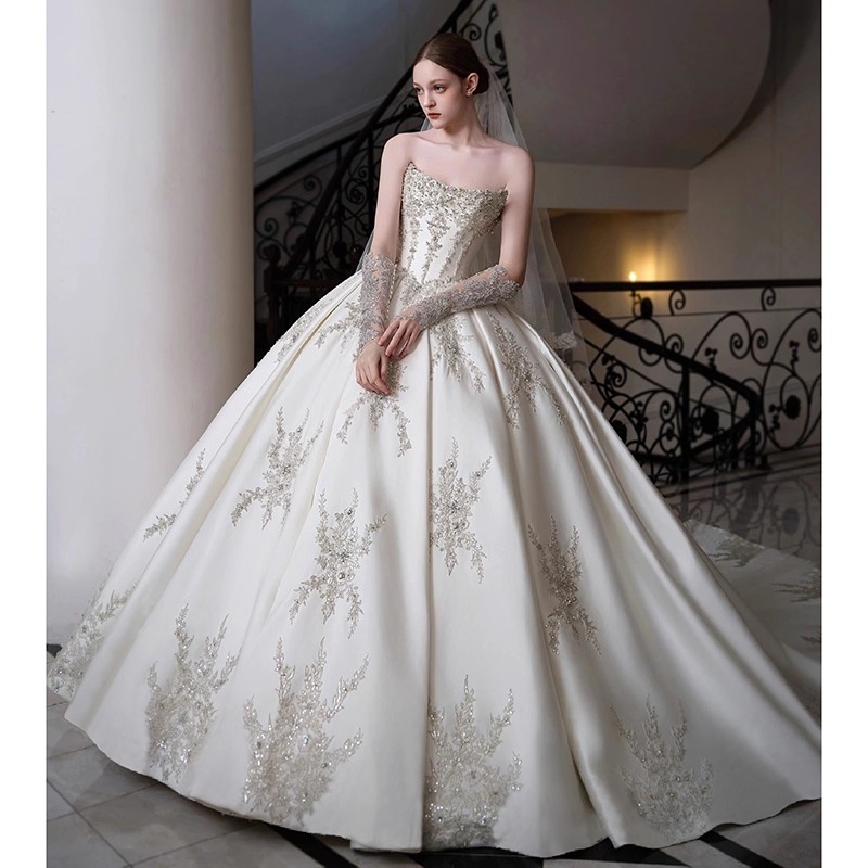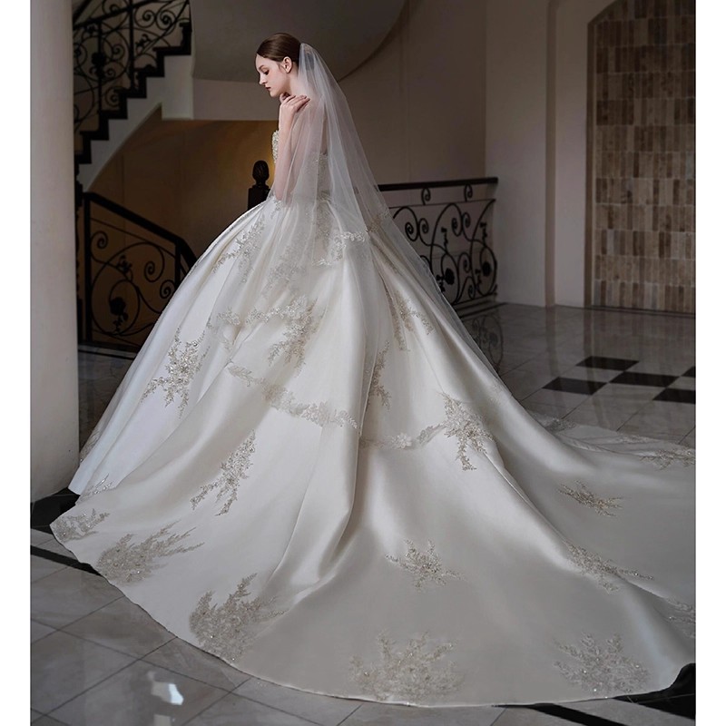 · The majestic ball gown skirt and overall proportions maintain the ceremonial presence expected of a gown fit for a grand occasion.
