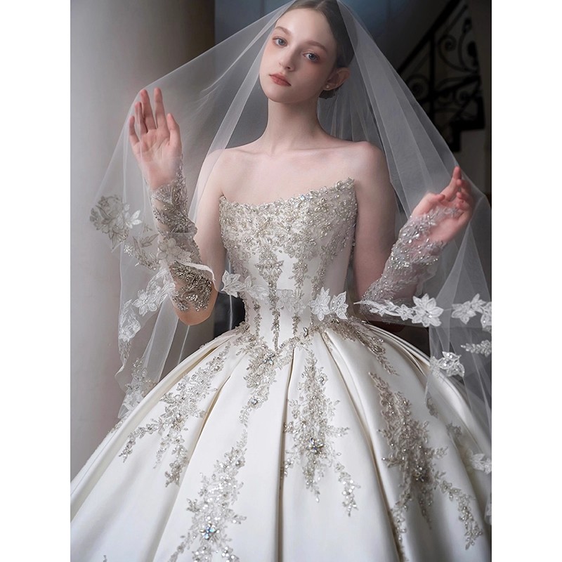 While updated,this gown is deeply rooted in the elegance of court vintage wedding dresses. It draws inspiration from the structured silhouettes and lavish surface decoration of ceremonial attire, translating it for today: